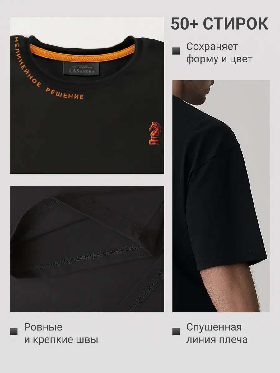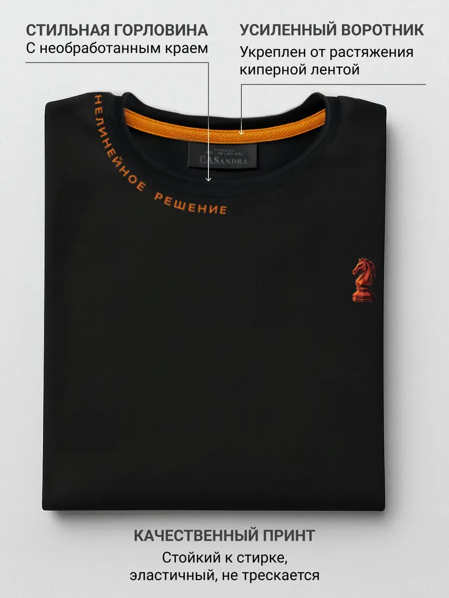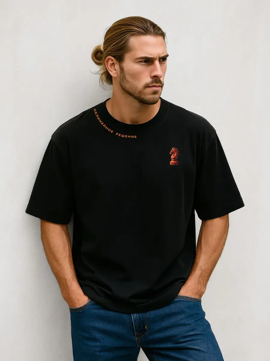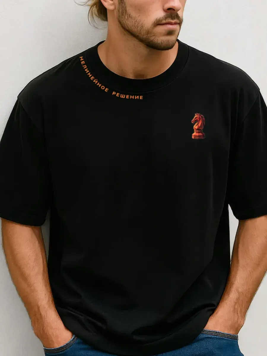 Футболка мужская черная с принтом красного коня и надписью – это идеальное сочетание стиля и комфорта. Оригинальная надпись по горловине – Нелинейное решение подчеркнет индивидуальность и расскажет, что это человек, кто ставит цели и всегда находит решения каким путем идти к этой цели. Новогодний принт огненной лошади (коня) актуальный в 2026 году поэтому футболка унисекс хорошо подойдет на подарок мужчине или другу, начальнику, руководителю, брату или сестре. Такой подарок порадует любителей шахматной игры, людей принимающих управленческие решения или работающих над проектами. Футболка черного базового цвета и подойдет под любой повседневный, удобный кэжуал стиль. Идеальный фасон oversize обеспечивает комфортную посадку на любую фигуру и на любой рост, в том числе для высоких и низких для полных и худых. У нее свободный крой, стильный и современный силуэт, удлиненный свободный рукав, спущенное плече, оригинальная обрезная не обработанная горловина и принт. Изделие отшито из турецкого трикотажа премиум качества пенье. Состав ткани 95% хлопок и 5% лайкра, что обеспечивает долгий срок службы, футболка не мнется, не скатывается не растягивается и выдерживает много стирок. Оригинальная надпись по горловине – Нелинейное решение подчеркнет индивидуальность и расскажет, что это человек, кто ставит цели и всегда находит решения каким путем идти к этой цели. Крутая мужская футболка станет украшением в любом гардеробе. Свободный крой позволяет легко комбинировать ее с любыми вещами, эта черная футболка с принтом прекрасно подойдет как для прогулок по городу, так и для домашнего отдыха, работы и тренировок. Эта вещь станет отличным подарком любимым папе, другу, парню на 23 февраля или на день рождения и новый год. Добавьте в свой гардероб стильную и практичную футболку оверсайз с принтом и будьте в центре внимания!