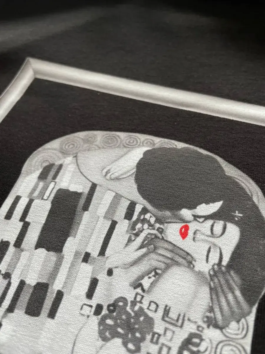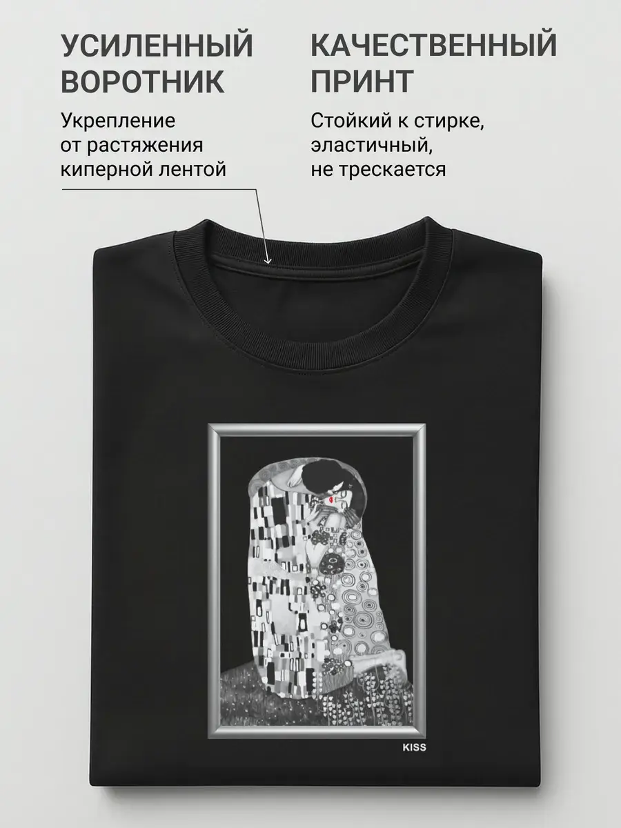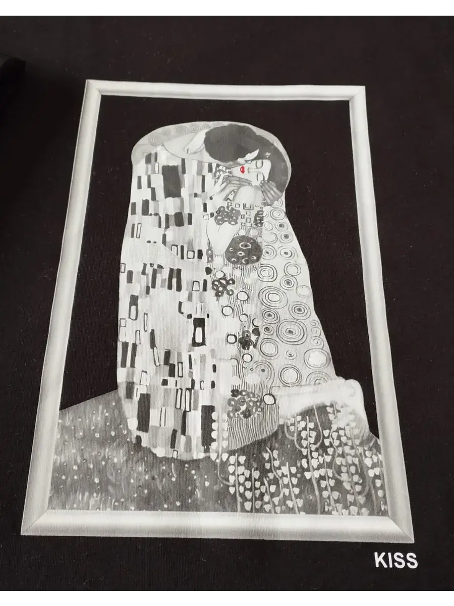 Принт с картиной — для тех, кто любит живопись и готов делиться своей любовью с окружающими. Надпись kiss дополняет этот посыл.