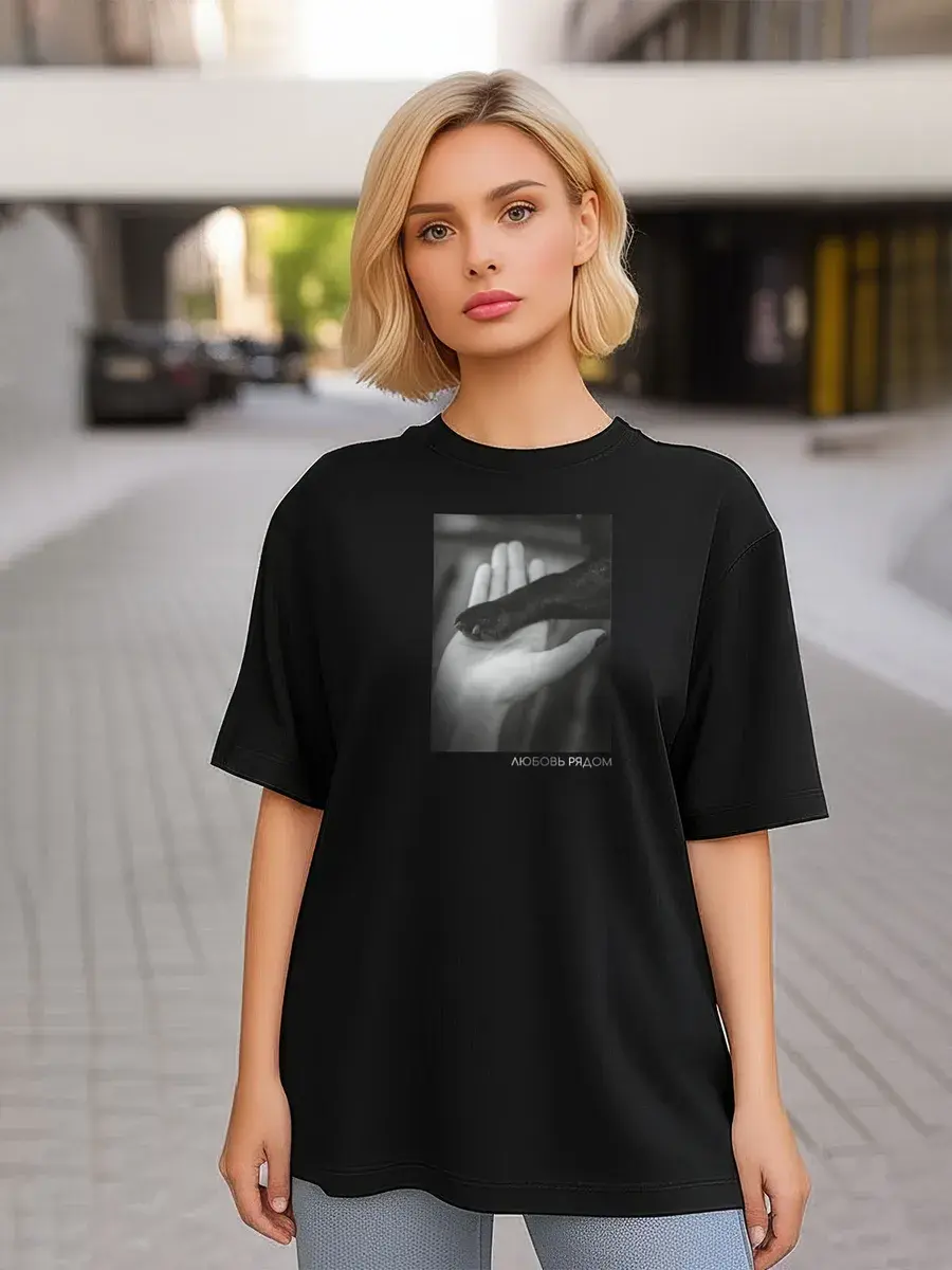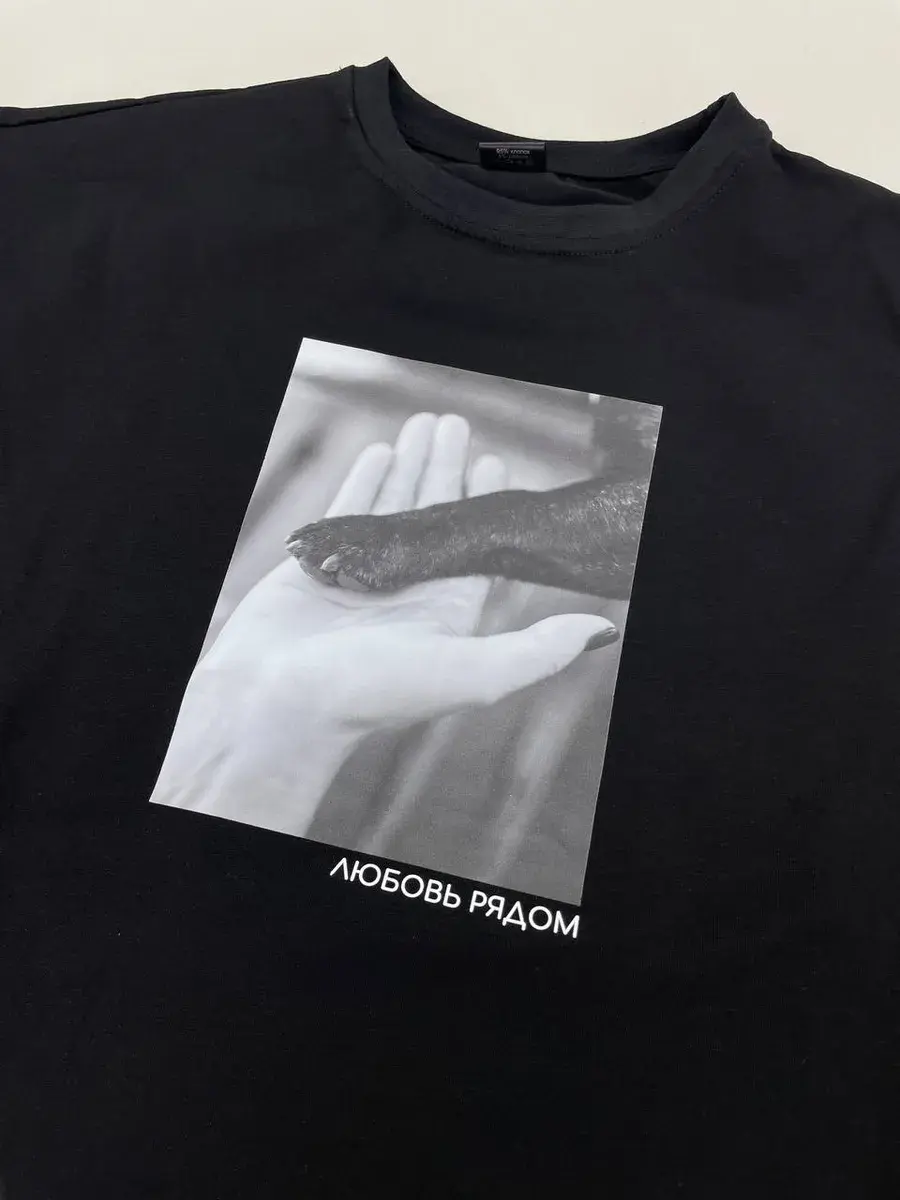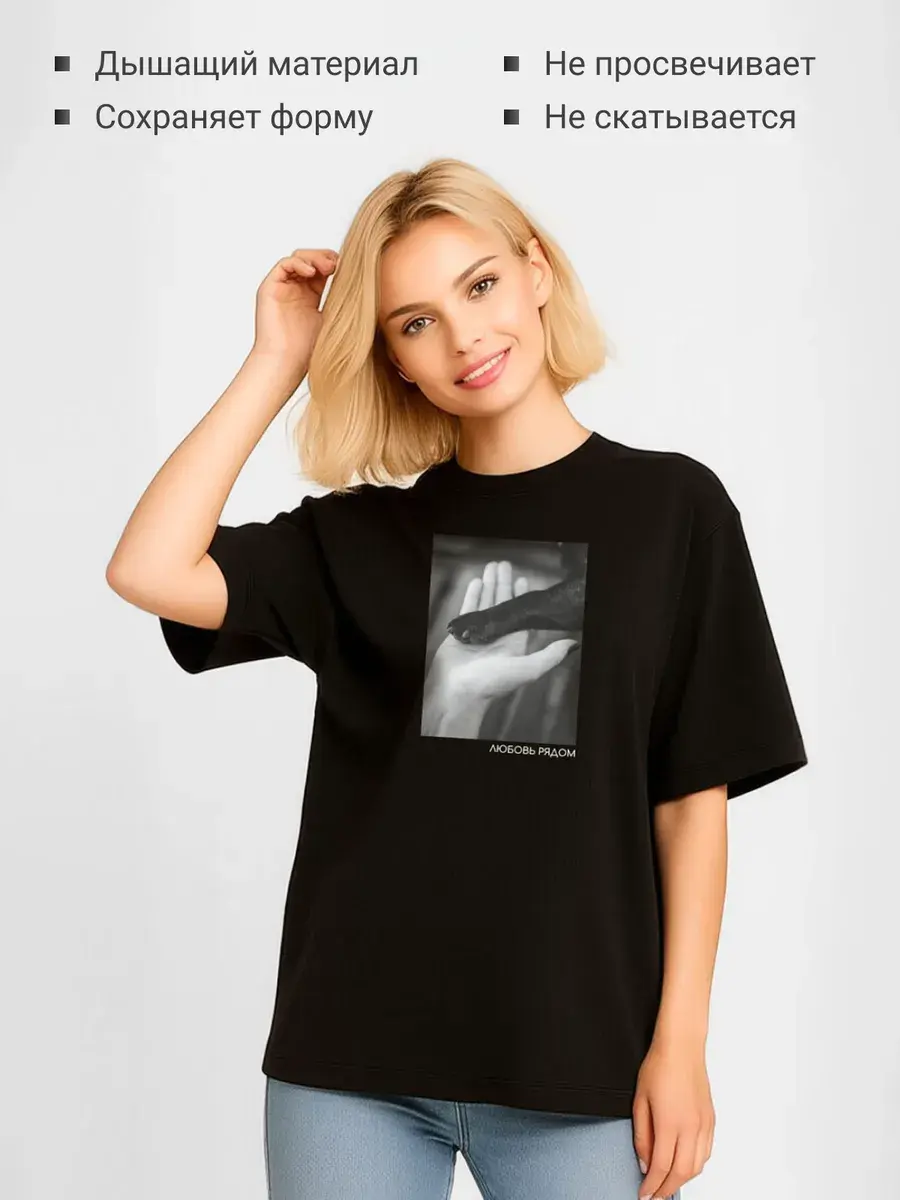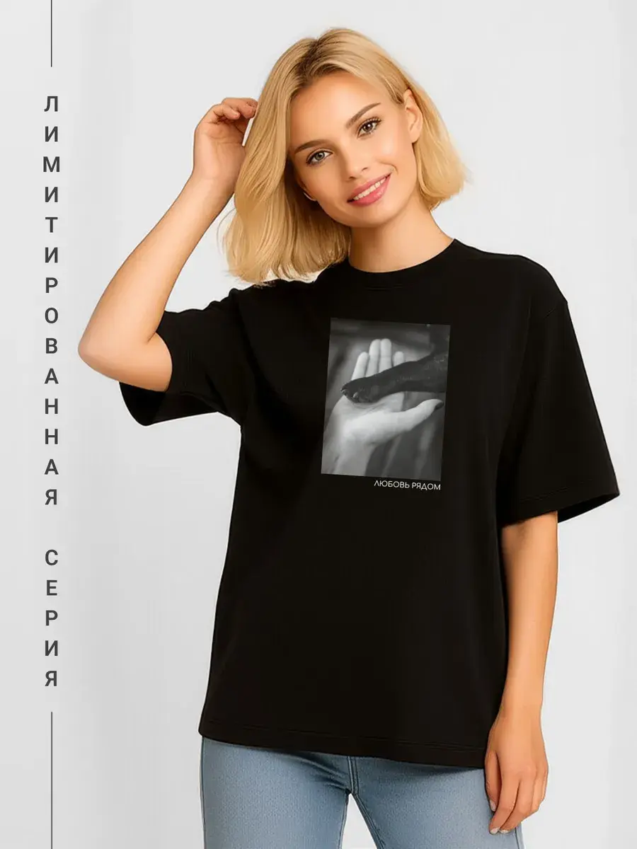 Представляем нашу дизайнерскую футболку оверсайз из лимитированной коллекции — идеальное сочетание стиля и комфорта. Это не просто очередная черная футболка с принтом - это эксклюзивная вещь из ограниченной серии, которая станет вашим украшением в гардеробе. Эта вещь транслирует ценности человека - любовь к животным, верность и приобщение к определенному стилю. Надпись «Любовь рядом» дополняет этот посыл.