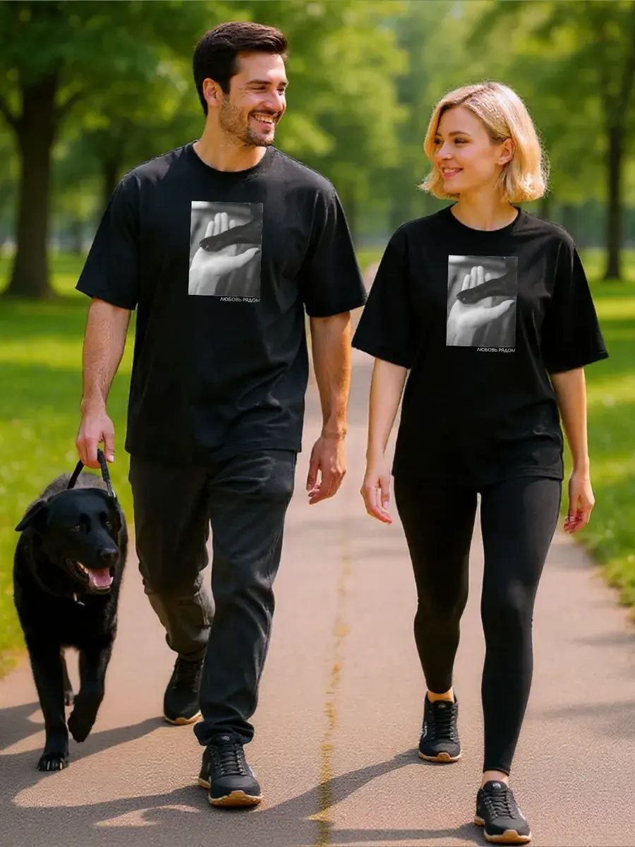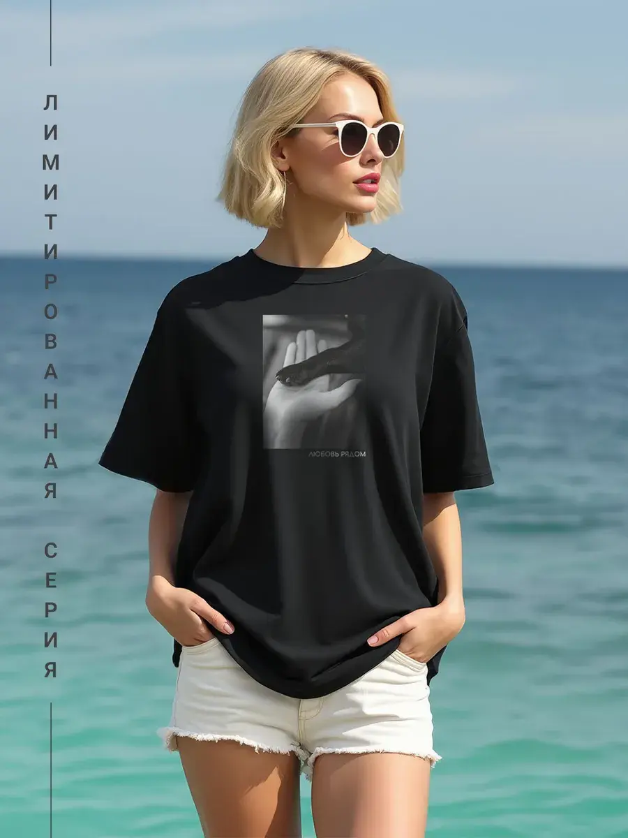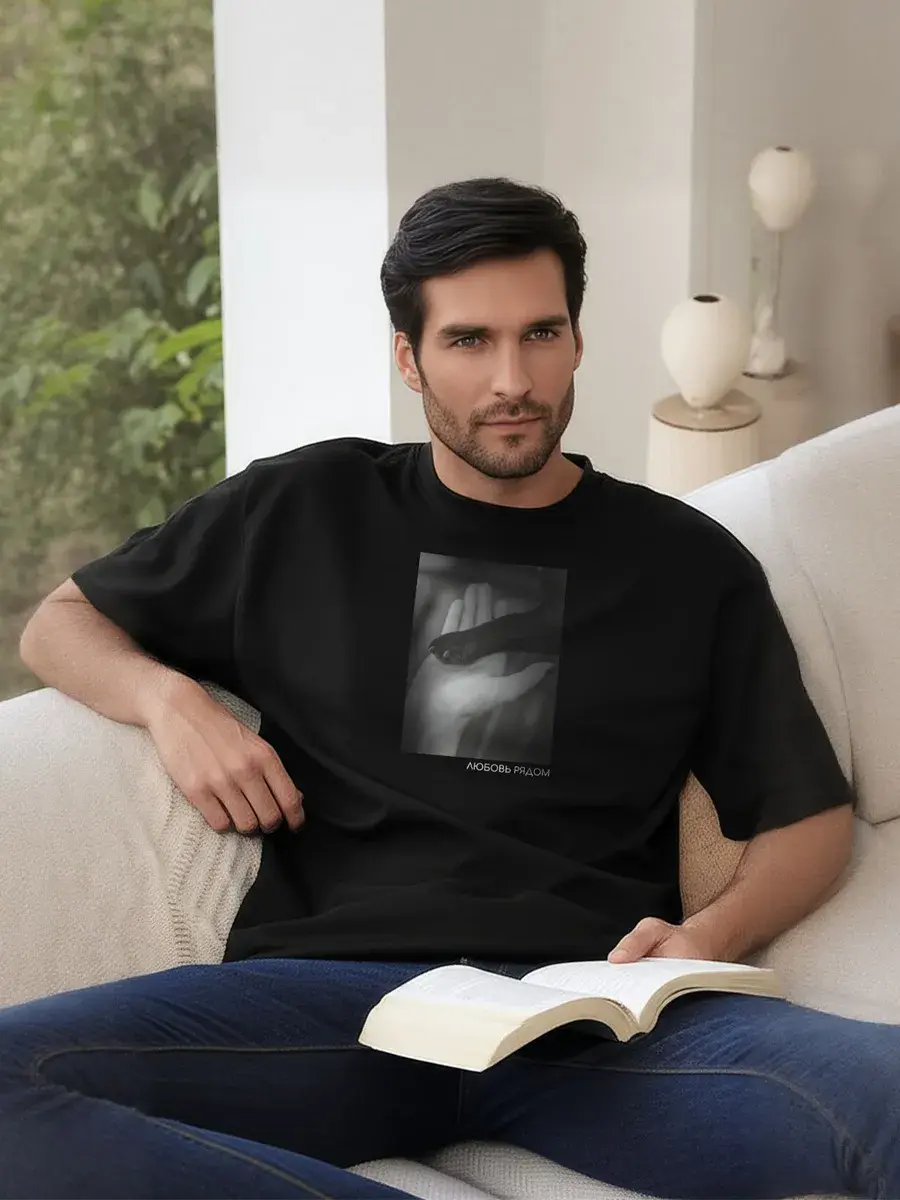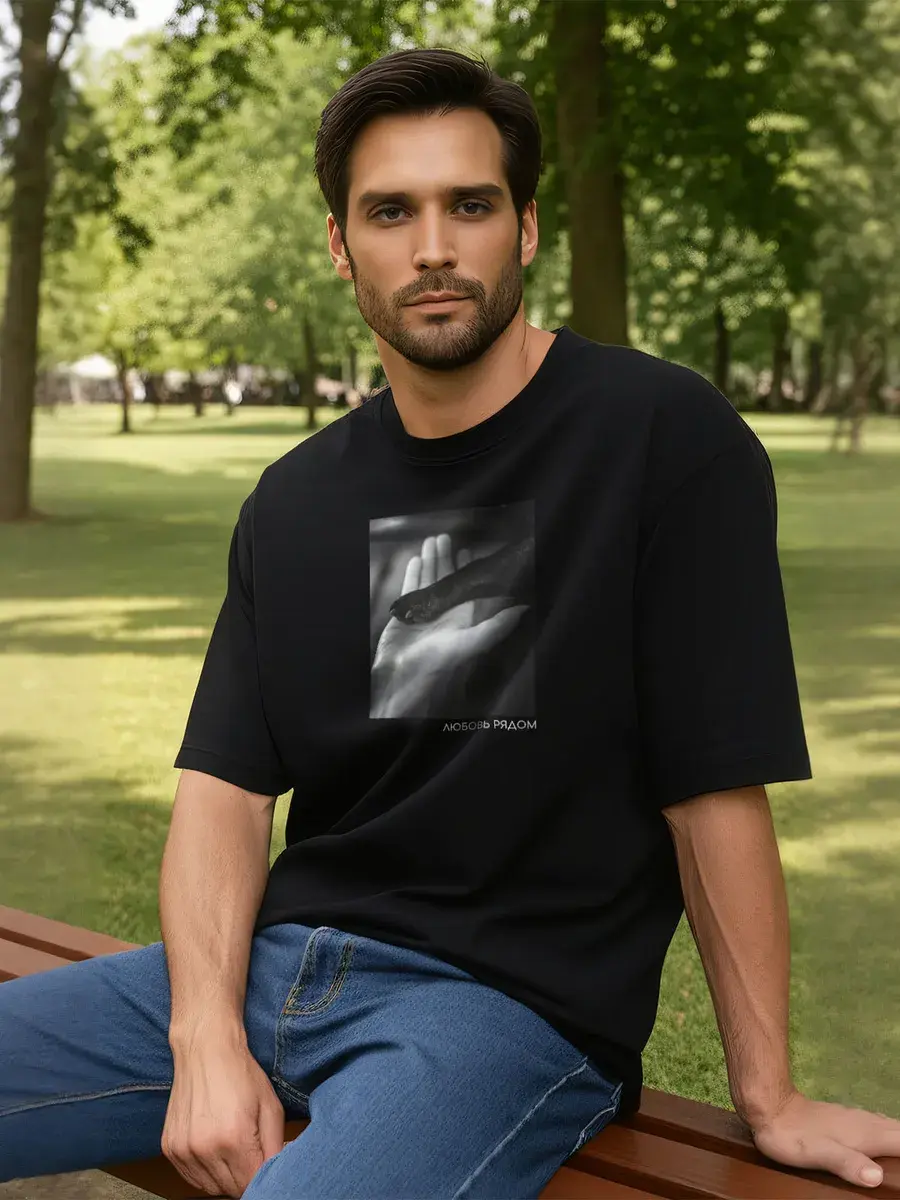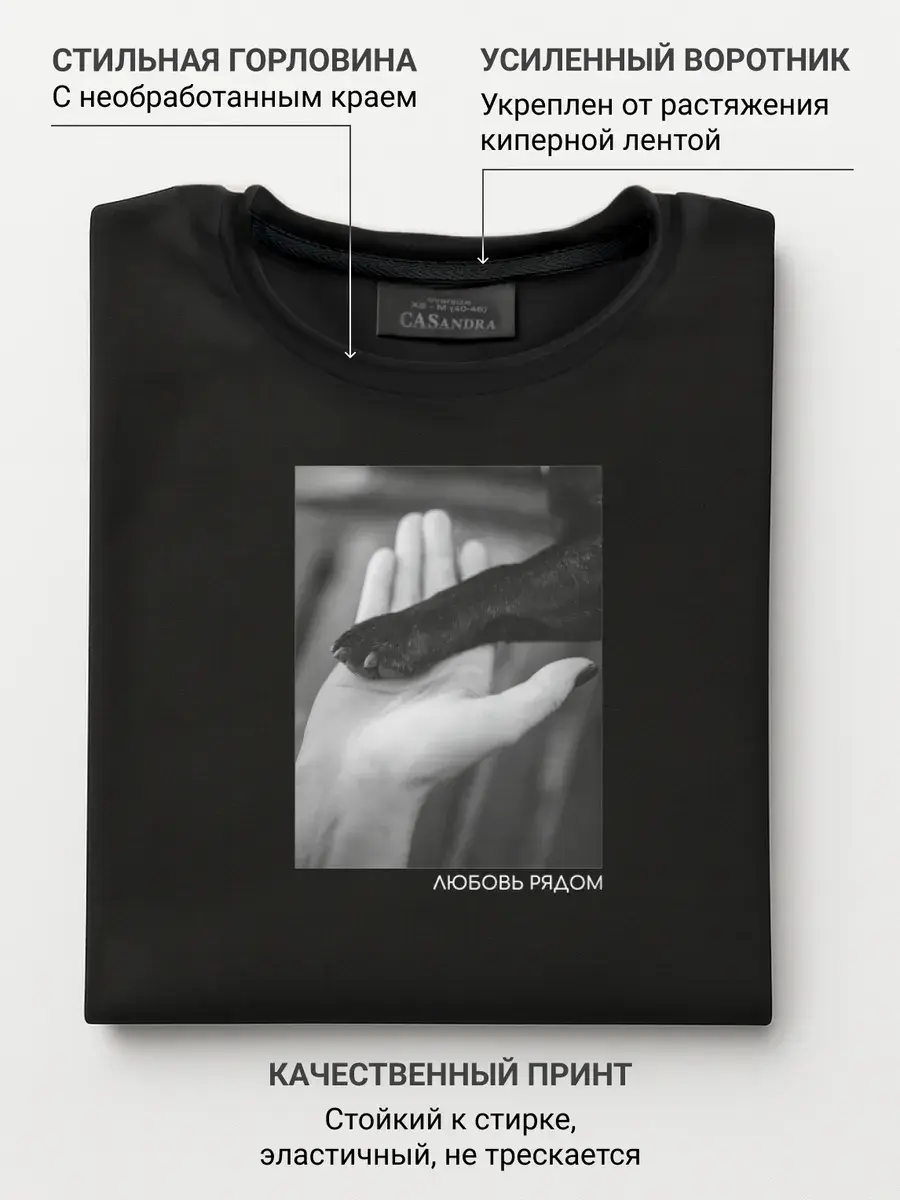 Представляем нашу дизайнерскую футболку оверсайз из лимитированной коллекции — идеальное сочетание стиля и комфорта. Это не просто очередная черная футболка с принтом - это эксклюзивная вещь из ограниченной серии, которая станет вашим украшением в гардеробе. Эта вещь транслирует ценности человека - любовь к животным, верность и приобщение к определенному стилю. Надпись «Любовь рядом» дополняет этот посыл.